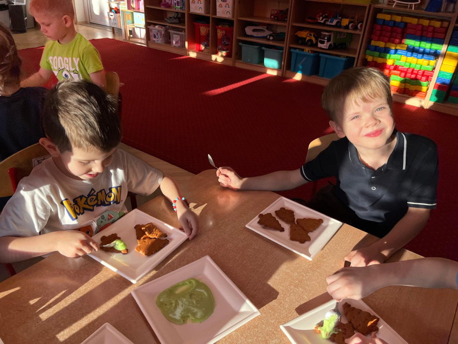 W grupie "Orzełki" zapanowała prawdziwie świąteczna atmosfera. Dzieci z ogromnym zaangażowaniem dekorowały pierniki, wykorzystując kolorowe lukry i różnorodne posypki.